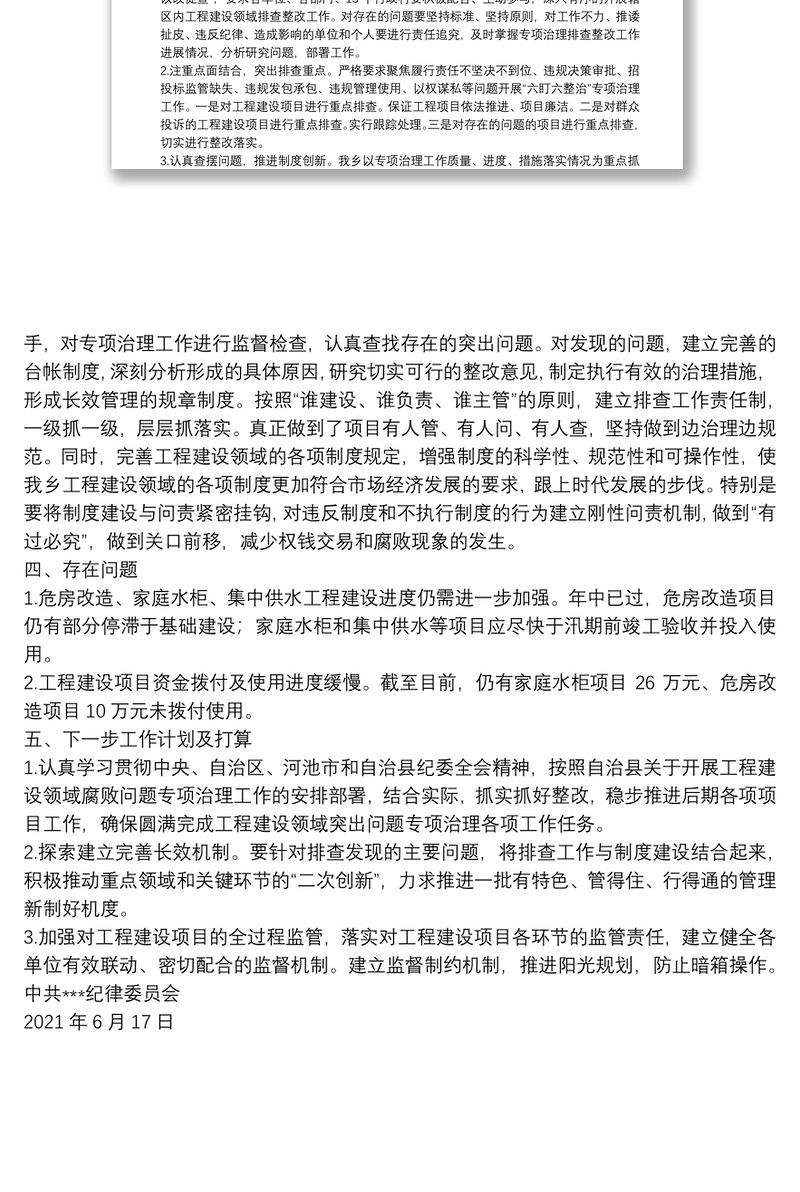 鄉鎮工程建設領域腐敗問題專項治理自查自糾情況報告