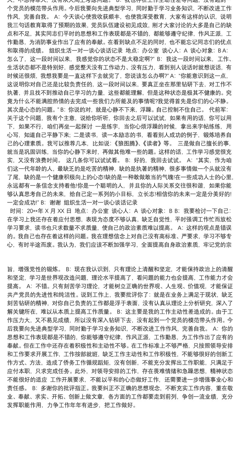 紀檢部門談心談話記錄內容一對一2022免費談心談話記錄內容一對一2022組織生活會工程談心談話記錄內容一對一2022國企談心談話記錄內容一對一2022意識形態談心談話記錄內容一對一2022民警黨員談心談話記錄內容一對一2022銀行員工學黨史談心談話記錄內容一對一2021黨員教師談心談話記錄內容一對一2022組織生活會醫生黨員談心談話記錄內容一對一2022談心談話記錄內容一對一2022組織生活會黨史護士談心談話記錄內容一對一20222021黨員教師談心談話記錄內容一對一供電系統談心談話記錄內容一對一2022組織生活會2023新時代中國特色社會主義思想談心談話記錄談話要點醫護人員談心談話記錄2022年最新一對一2023談心談話記錄廉政談話