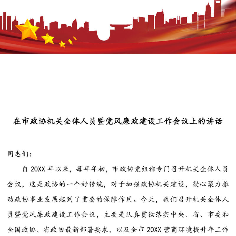 工圖網提供在市政協機關全體人員暨黨風廉政建設工作會議上的講話供會員免費下載。更多精彩黨課PPT素材,盡在工圖網。