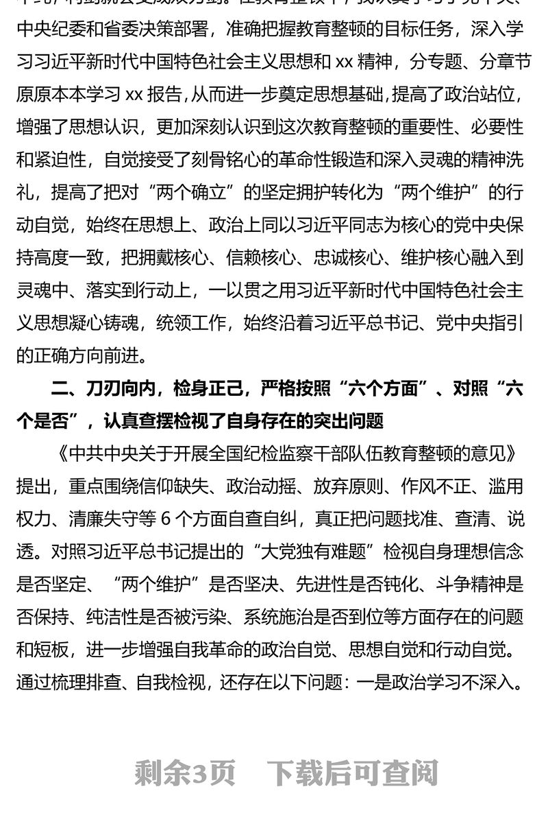 紀委書記紀檢監察干部隊伍教育整頓個人對照檢查材料檢視剖析發言提綱包含