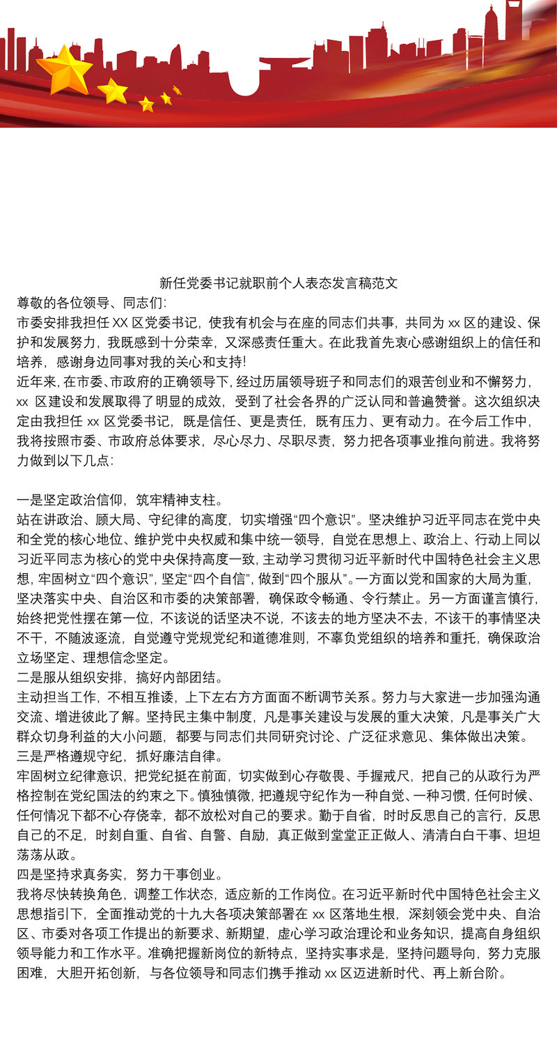 新任黨委書記就職前個人表態發言稿范文 Array