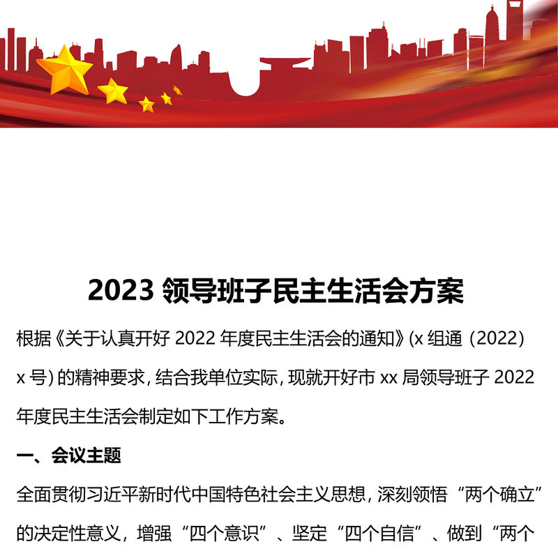 2023領導班子民主生活會方案PPT紅色黨政風黨員干部學習教育專題黨課黨建課件模板(講稿)