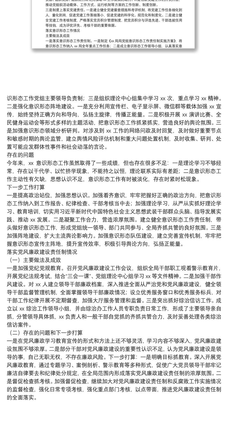述職報告 > X局抓基層黨建、落實意識形態工作和黨風廉政建設責任制述職報告.DOCX