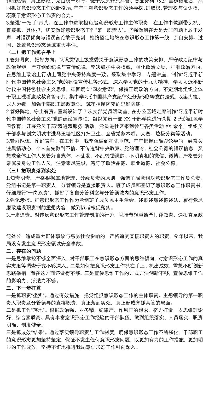 關于20xx年履行意識形態工作“第一職責人”責任情況的報告范文