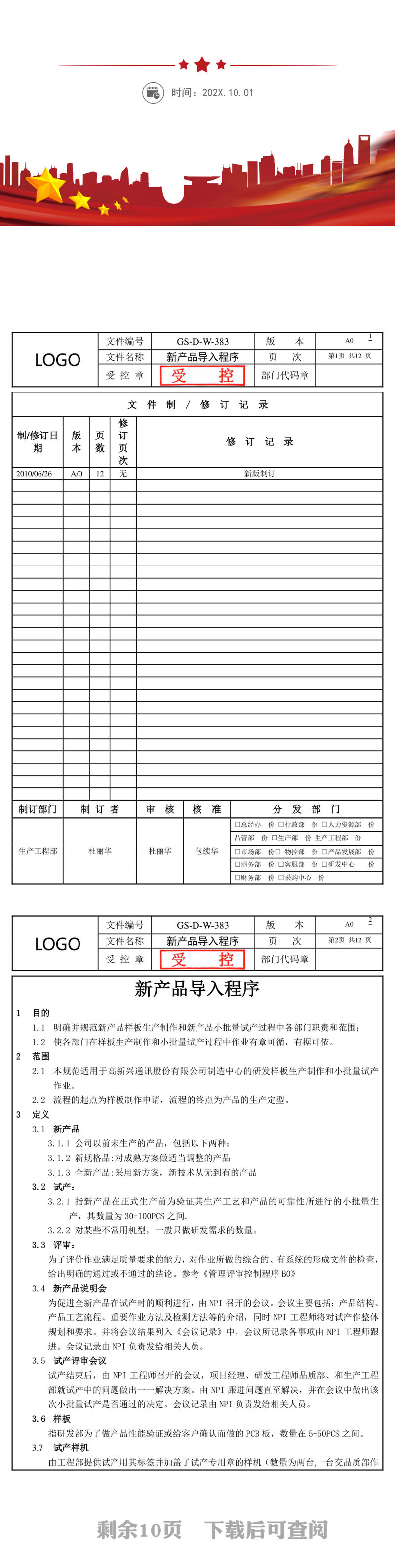 新產(chǎn)品導入程序(經(jīng)典),修訂記錄表,新產(chǎn)品導入程序,研發(fā)樣板生產(chǎn)流程,小批量試產(chǎn)流程,試產(chǎn)檢討和評審,機動小批量管控 Array