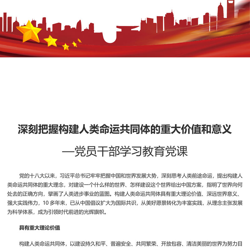 黨課講稿 > 深刻把握構建人類命運共同體的重大價值和意義PPT紅色黨政風黨員干部學習教育黨課課件(講稿).DOCX