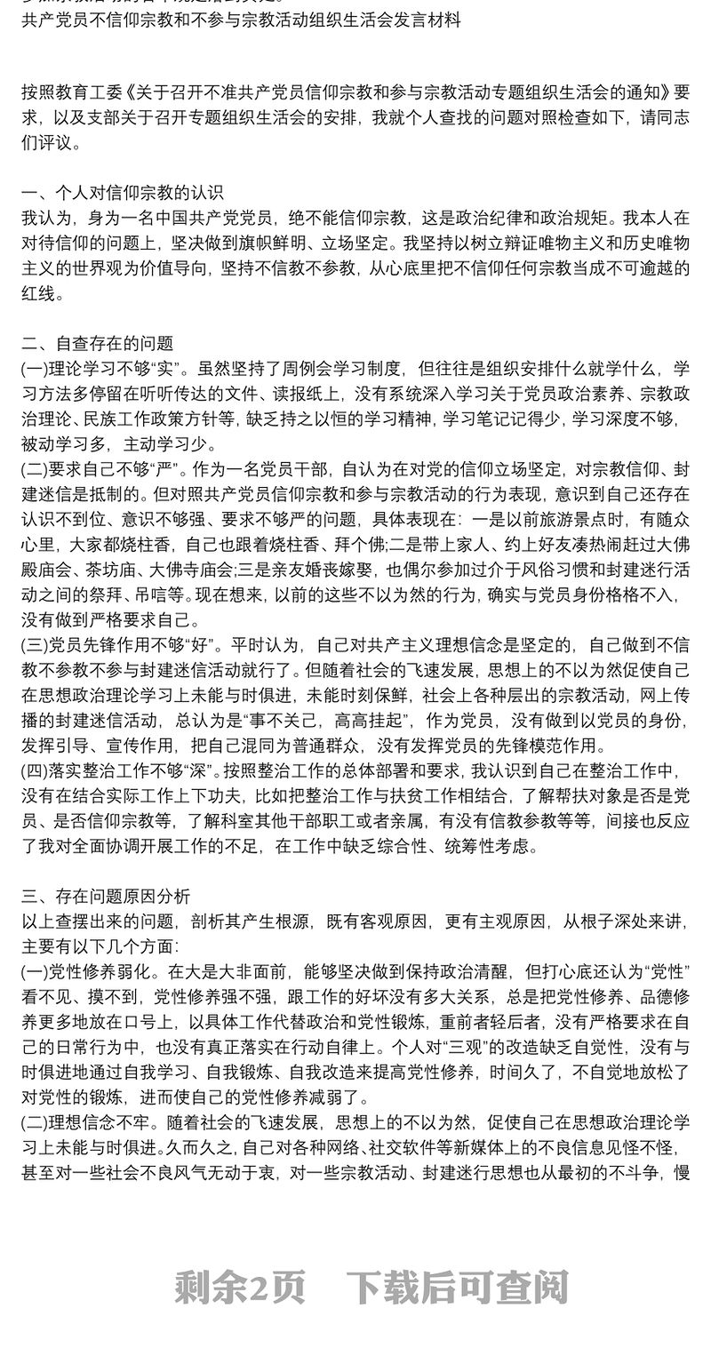 黨員不信仰宗教,不參與宗教活動專題組織生活會對照檢查材料包含