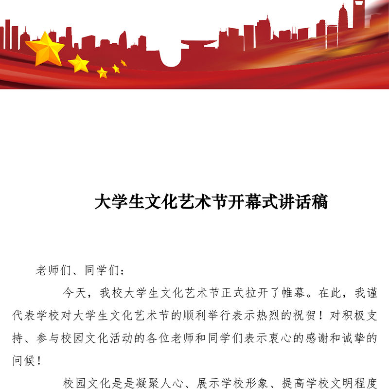工圖網提供2021大學生文化藝術節開幕式講話稿供會員免費下載。更多精彩黨課PPT素材,盡在工圖網。
