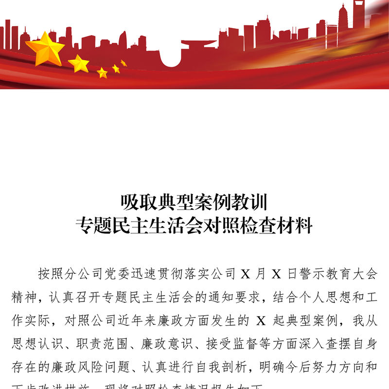 工圖網提供吸取典型案例教訓(警示教育)專題民主生活會對照檢查材料供會員免費下載。更多精彩黨課PPT素材,盡在工圖網。