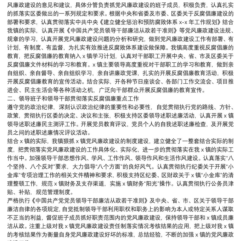 鎮黨委關于落實黨風廉政建設責任制工作情況的自檢自查報告